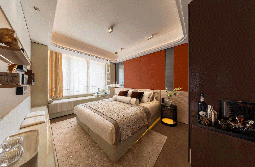 137㎡户型仅主卧与主卫的采光面就达到了约12.7米,主卧配备了270°转角飘窗,将自然光与视野极大化引入室内,形成可休憩、观景与阅读的复合功能角落。