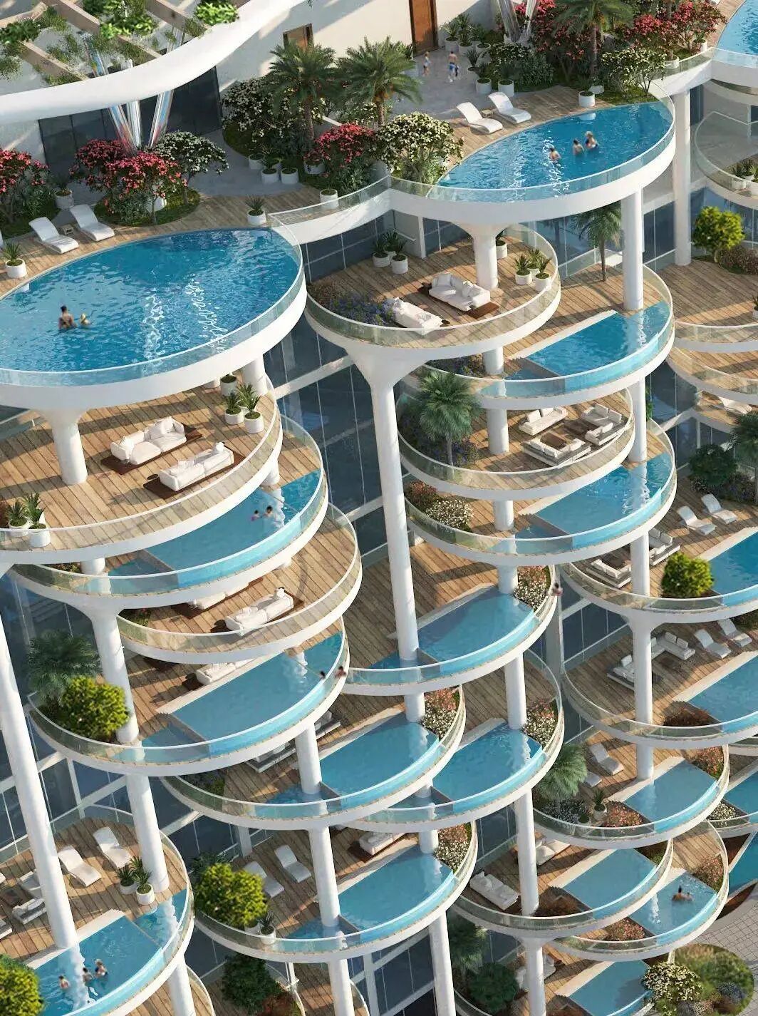 一般来说,发达国家先行的一些普遍认识,严格意义上:1、每层有公共庭院;2、每户有独立的私家开敞庭院,庭院可以布置绿植、游泳池等等覆土、注水等功能;3、顶级的甚至实现每层空中停车。