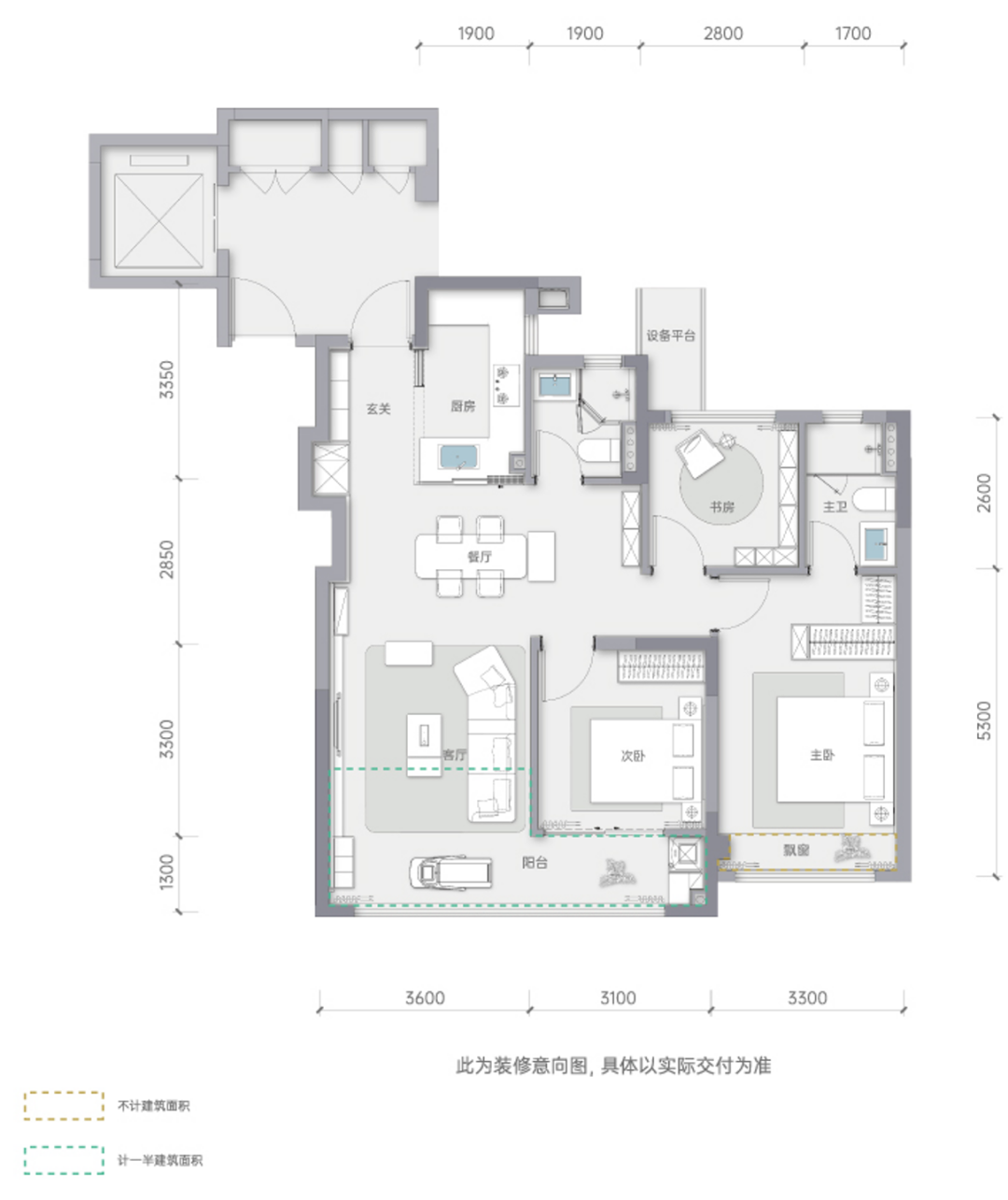 沐芳洲118㎡四房两卫户型,几乎没有浪费的空间,接近100%的得房率,边套户型接近270°的采光面,左上角的设备平台有可能还可以利用。还有一个特点是客卫的方向朝两个次卧,而没有用传统的做法朝向客厅,形成类套房的结构,完全动静分区,特别适合家里有老人的家庭。