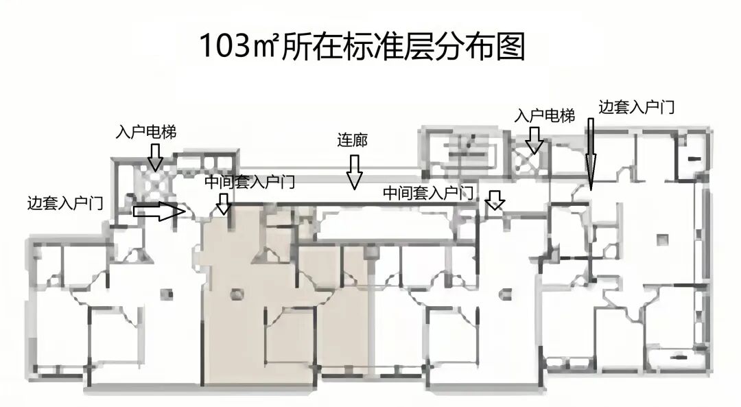 下面这个是103㎡的三室两卫户型,乍一看可能觉得平淡无奇,但从单元的整体结构来看就有点意思了。