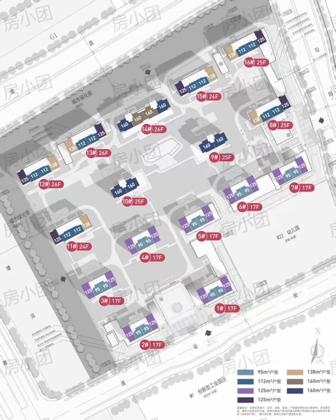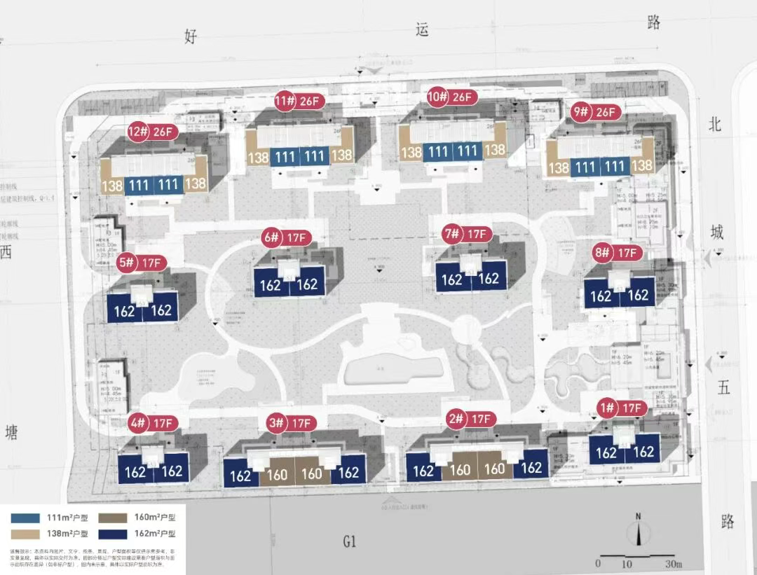 月映海棠园整体户数为1228户,挂牌62套,户型面积95-160㎡,跨度比较大,95㎡、112㎡中间套和125㎡的边套占比大,少量138㎡边套,楼王楼幢直接跳到160㎡。