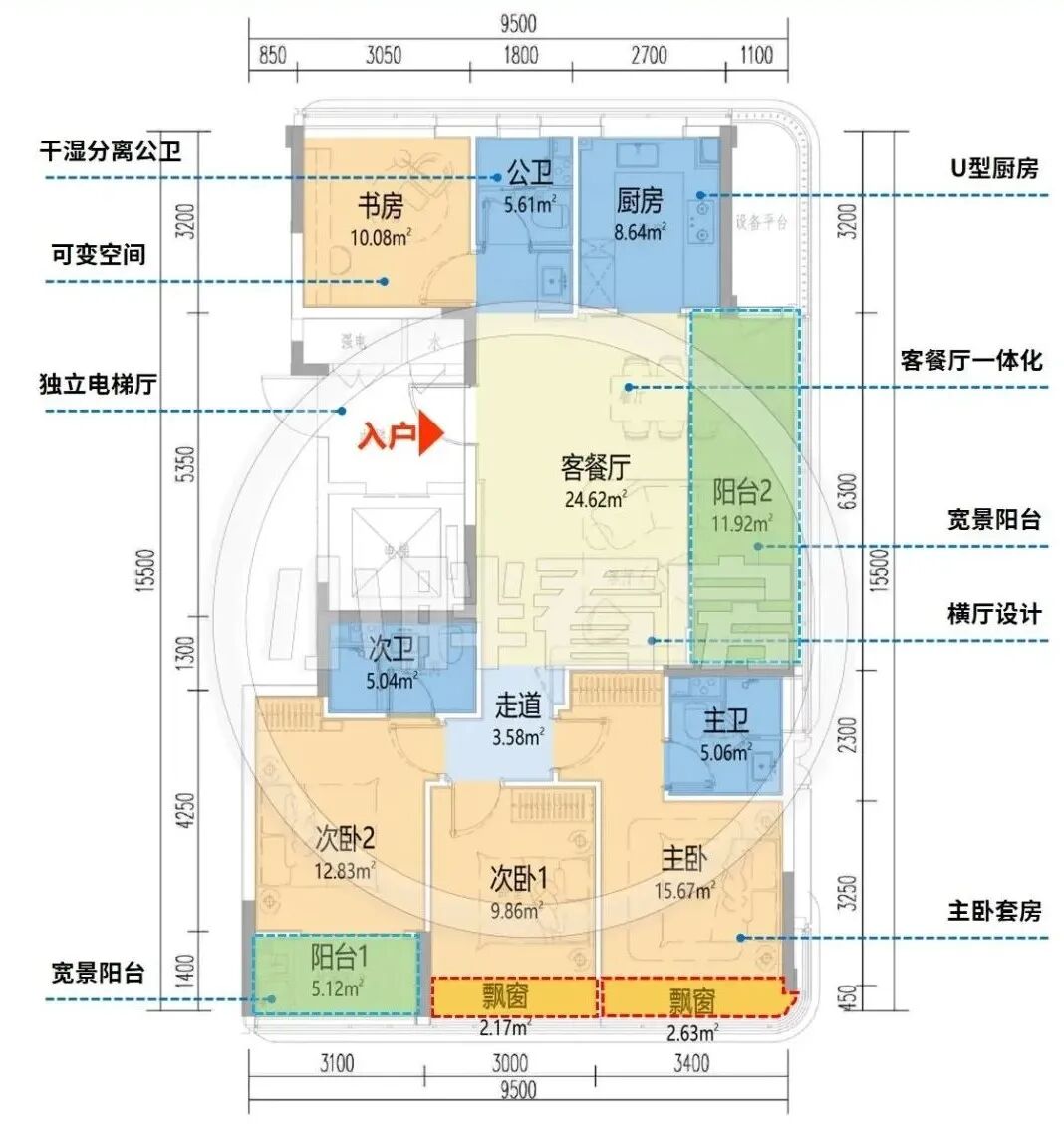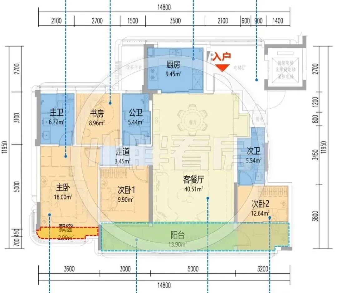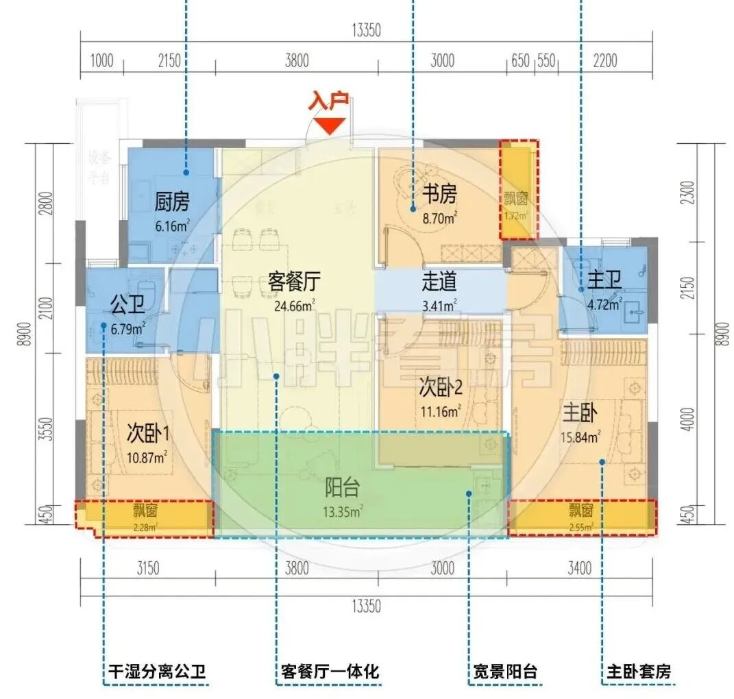 望舟府122㎡是连廊户型的中间套,这一点是减分项,整体南向面宽达13.35米,这个户型与绿城刚售罄的悦海棠的125㎡中间套几乎一模一样。