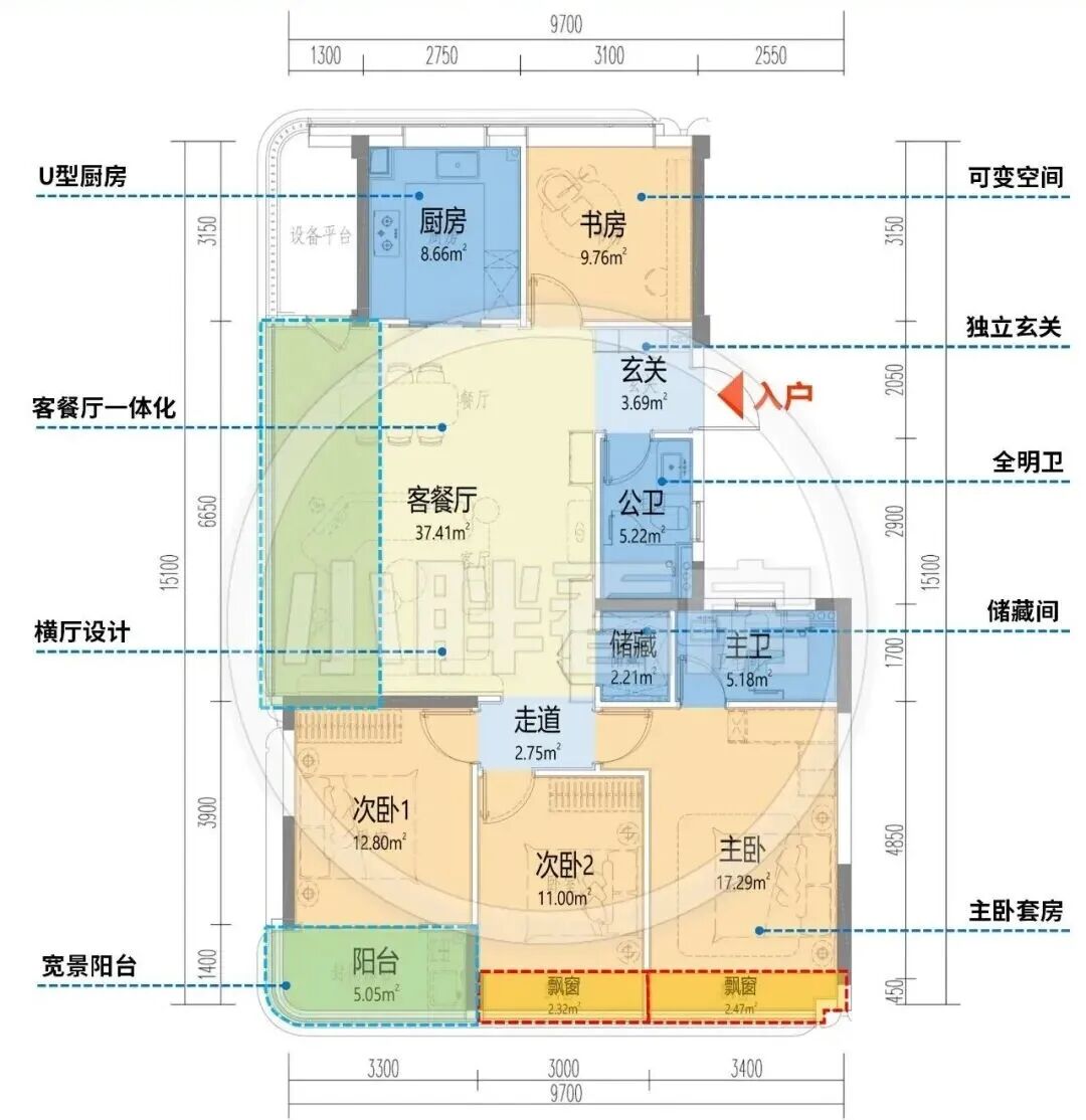 四个户型的南向面宽在9.45米-9.7米之间,进深在15米左右,整体来说四个户型差别并不大,区别在于功能区的尺度。