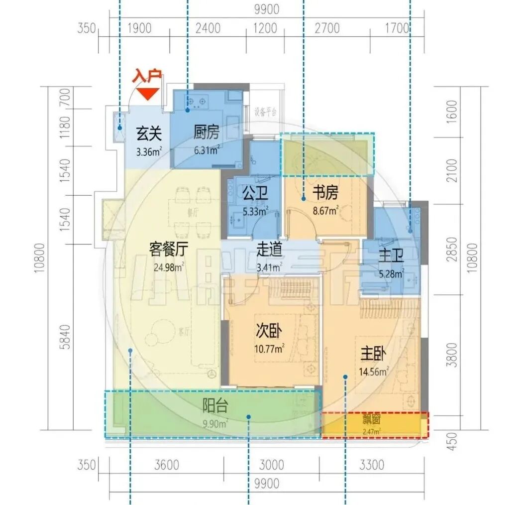 望舟府128㎡边套有了点创新,虽然是边套户型,但依旧做了南厅。动静完全分区,主卧和卫生间做了转角带弧线的飘窗,这个户型还是蛮有想象力的。