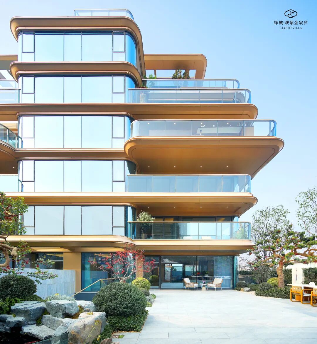 绿城·观紫金宸庐的外立面是弧形铝板加曲面玻璃,园林是照着杭州那些单价十万以上的顶级豪宅去做的。但绿城·观紫金宸庐的单价是3.66万元/㎡起,相当于高层的价格买了叠墅,是不是有种捡了大便宜的感觉。