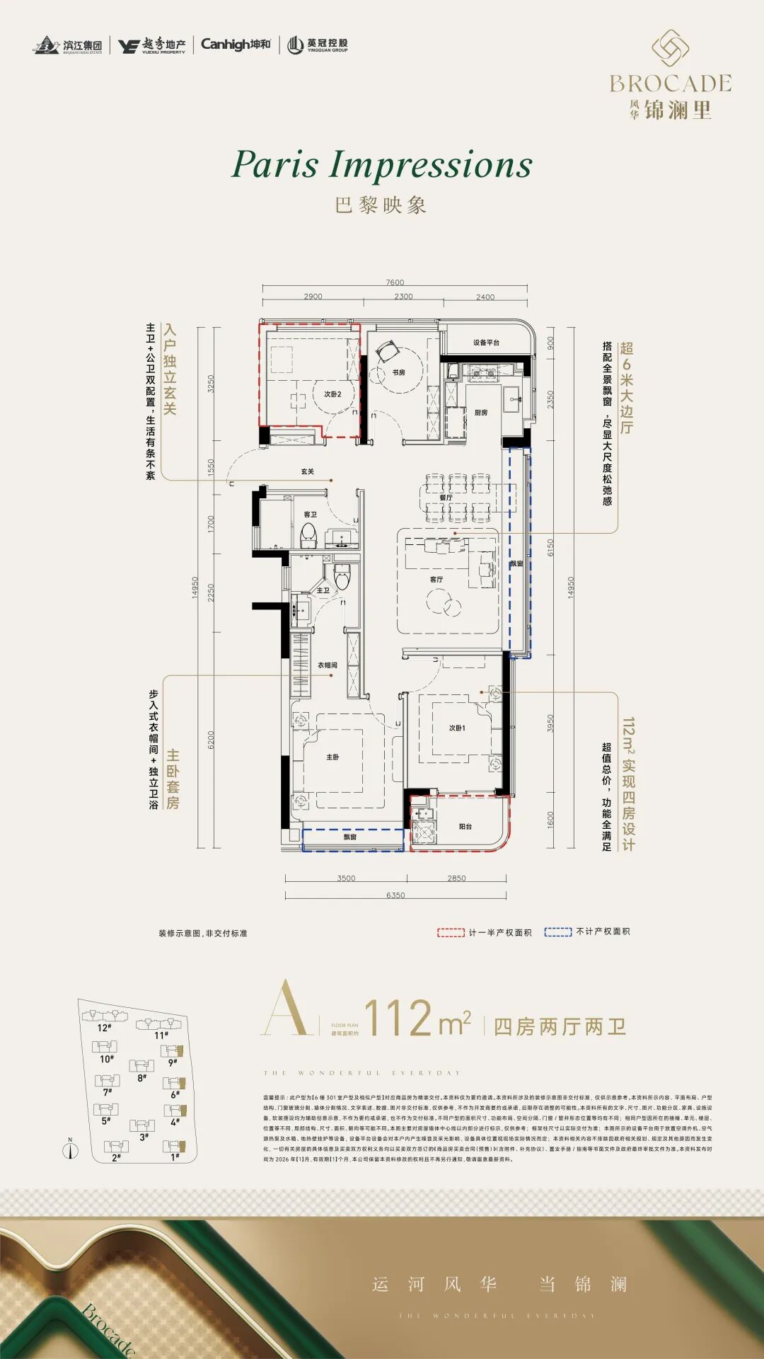 拿112㎡来算笔账:同样买建筑面积112㎡,新规前的楼盘得房率普遍在80%-82%,实际能用的大概90-92㎡。而风华锦澜里能用约100㎡,多出近9㎡。
