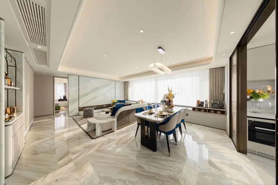 客厅的天然大理石地面和电视背景墙,不是那种薄薄一层贴皮,是实打实的大理石。不仅打理起来方便,时间长了更能验证日久弥新的价值。