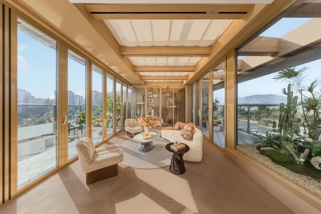 上叠的一楼有小花园入户,四楼有约25㎡的客厅大露台,五楼还有约70㎡的屋顶揽山露台。加起来近100㎡的户外空间。卧室都在三楼,动静分离。你可以在露台上烧烤、喝茶、看星星,老人可以在屋顶种花。