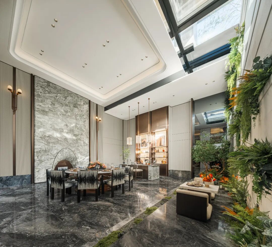 你看精装。餐客厅大理石地面、木饰面墙面(局部)、岩板背景墙、老板四件套、日空地暖新风三件套……这些都是交付标准。你想起之前看的一些叠墅,毛坯交付,自己装下来又要上百万。这里省了。