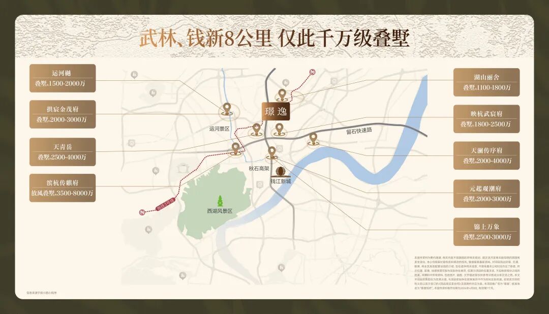 这些盘跟武林广场的直线距离,大多在8公里左右。而就在同样的半径内,我找到了一个总价1000-1500万的叠墅——璟逸逸墅。