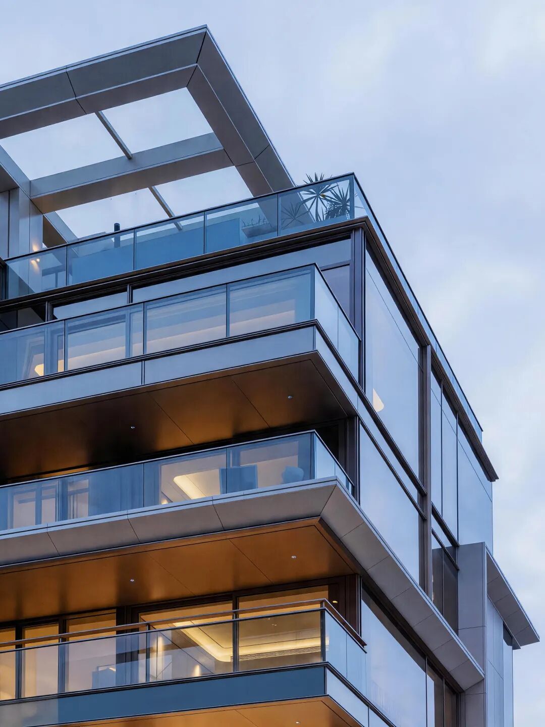 先说立面。金色铝板+沉香米黄石材+奥映鸣翠同款茶金色玻璃,很漂亮,这套配置放在任何板块都算得上顶配了。设计师用铝型材线条把每两层框成一个独立的“景框”,整栋楼像一组悬浮的玻璃盒子。每一户的阳台位置都不一样,这就是大师的手笔,拒绝千篇一律。
