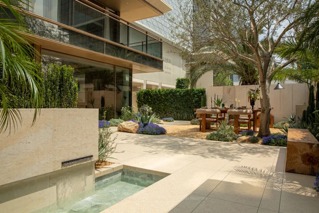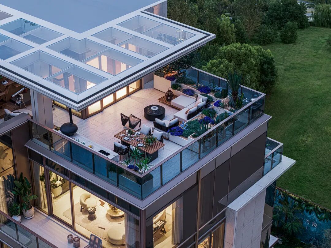 再看院子,那才是灵魂。下叠做了抬高设计,独门独户,而无论上中下叠每一户都有独立的入户通道和电梯厅。其中下叠边套的院子最小约120方,最大超过240方。能晒到太阳的院子,才叫院子。孩子疯跑、老人种花、你摆茶席看夕阳,都可以。